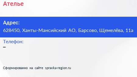 Ателье по адресу 628450, Ханты-Мансийский АО, Барсово, Щемелёва, 11а в дальнейшем Организация, размещена в следующих категориях: