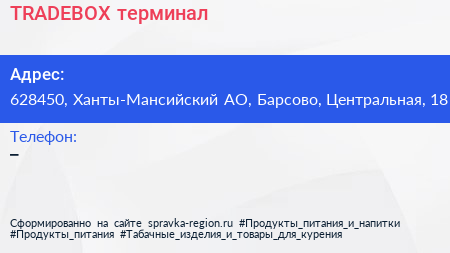 TRADEBOX, терминал по адресу 628450, Ханты-Мансийский АО, Барсово, Центральная, 18 в дальнейшем Организация, размещена в следующих категориях: