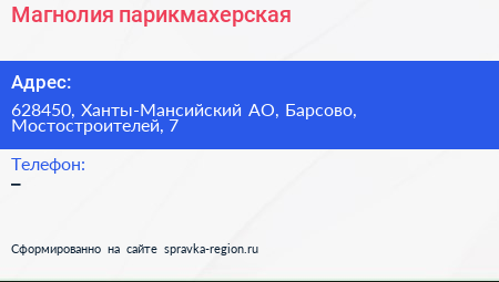 Магнолия, парикмахерская по адресу 628450, Ханты-Мансийский АО, Барсово, Мостостроителей, 7 в дальнейшем Организация, размещена в следующих категориях: