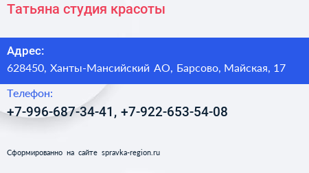 Татьяна, студия красоты по адресу 628450, Ханты-Мансийский АО, Барсово, Майская, 17 в дальнейшем Организация, размещена в следующих категориях: