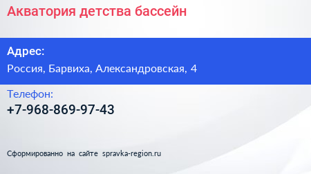 Акватория детства, бассейн по адресу Развлекательный центр "Ильинка", 3, Александровская улица, Петровский, Петрово-Дальнее, городской округ Красногорск, Московская область, Центральный федеральный округ, 143084, Россия в дальнейшем Организация, размещена в следующих категориях: