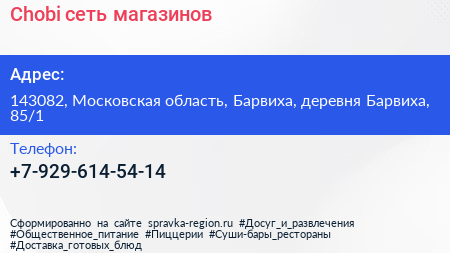 Chobi, сеть магазинов по адресу 143082, Московская область, Барвиха, деревня Барвиха, 85/1 в дальнейшем Организация, размещена в следующих категориях: