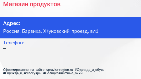 Магазин продуктов по адресу Жуковский проезд, посёлок дачного хозяйства "Жуковка", дачного хозяйства "Жуковка", Одинцовский городской округ, Московская область, Центральный федеральный округ, 143084, Россия в дальнейшем Организация, размещена в следующих категориях: