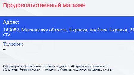Продовольственный магазин по адресу 143082, Московская область, Барвиха, посёлок Барвиха, 31 ст2 в дальнейшем Организация, размещена в следующих категориях: