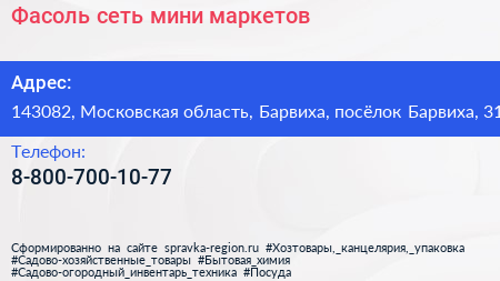Фасоль, сеть мини-маркетов по адресу 143082, Московская область, Барвиха, посёлок Барвиха, 31 в дальнейшем Организация, размещена в следующих категориях:
