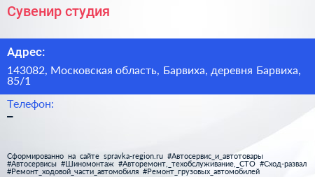 Сувенир-студия по адресу 143082, Московская область, Барвиха, деревня Барвиха, 85/1 в дальнейшем Организация, размещена в следующих категориях: