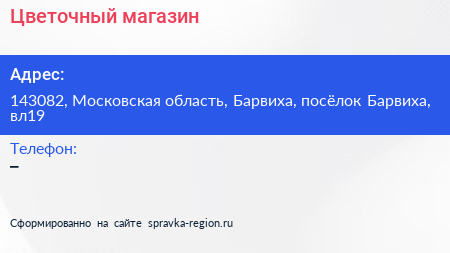 Цветочный магазин по адресу 143082, Московская область, Барвиха, посёлок Барвиха, вл19 в дальнейшем Организация, размещена в следующих категориях: