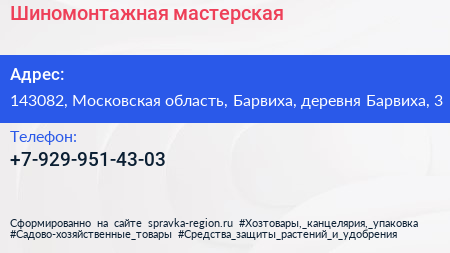 Шиномонтажная мастерская по адресу 143082, Московская область, Барвиха, деревня Барвиха, 3 в дальнейшем Организация, размещена в следующих категориях: