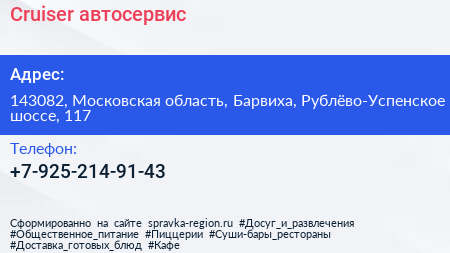 Cruiser, автосервис по адресу 143082, Московская область, Барвиха, Рублёво-Успенское шоссе, 117 в дальнейшем Организация, размещена в следующих категориях: