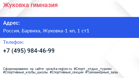 Жуковка, гимназия по адресу Рублёво-Успенское шоссе, посёлок дачного хозяйства "Жуковка", дачного хозяйства "Жуковка", Одинцовский городской округ, Московская область, Центральный федеральный округ, 143082, Россия в дальнейшем Организация, размещена в следующих категориях: