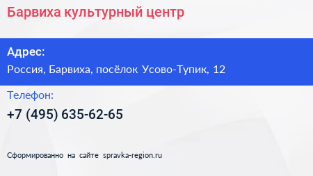 Барвиха, культурный центр по адресу Усово-Тупик 143084, 12, улица Ландшафт, КП «Ландшафт», Жуковка, Одинцовский городской округ, Московская область, Центральный федеральный округ, 143082, Россия в дальнейшем Организация, размещена в следующих категориях: