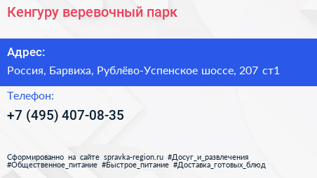 Кенгуру, веревочный парк по адресу Рублёво-Успенское шоссе, посёлок дачного хозяйства "Жуковка", дачного хозяйства "Жуковка", Одинцовский городской округ, Московская область, Центральный федеральный округ, 143082, Россия в дальнейшем Организация, размещена в следующих категориях: