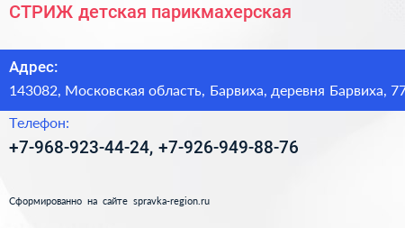 СТРИЖ, детская парикмахерская по адресу 143082, Московская область, Барвиха, деревня Барвиха, 77 в дальнейшем Организация, размещена в следующих категориях: