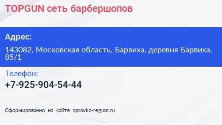 TOPGUN, сеть барбершопов по адресу 143082, Московская область, Барвиха, деревня Барвиха, 85/1 в дальнейшем Организация, размещена в следующих категориях: