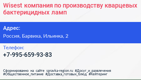 Wisest, компания по производству кварцевых бактерицидных ламп по адресу 1/2, Елисейская улица, Коттеджный посёлок «Ильинка», Ильинское, городской округ Красногорск, Московская область, Центральный федеральный округ, 143421, Россия в дальнейшем Организация, размещена в следующих категориях: