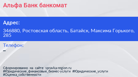 Альфа-Банк, банкомат по адресу 346880, Ростовская область, Батайск, Максима Горького, 285 в дальнейшем Организация, размещена в следующих категориях: