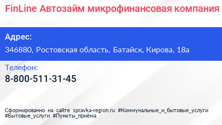 FinLine-Автозайм, микрофинансовая компания по адресу 346880, Ростовская область, Батайск, Кирова, 18а в дальнейшем Организация, размещена в следующих категориях: