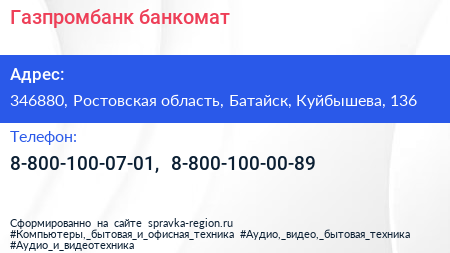 Газпромбанк, банкомат по адресу 346880, Ростовская область, Батайск, Куйбышева, 136 в дальнейшем Организация, размещена в следующих категориях: