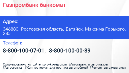 Газпромбанк, банкомат по адресу 346880, Ростовская область, Батайск, Максима Горького, 285 в дальнейшем Организация, размещена в следующих категориях: