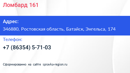 Ломбард 161 по адресу 346880, Ростовская область, Батайск, Энгельса, 174 в дальнейшем Организация, размещена в следующих категориях: