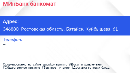 МИнБанк, банкомат по адресу 346880, Ростовская область, Батайск, Куйбышева, 61 в дальнейшем Организация, размещена в следующих категориях: