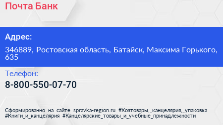 Почта Банк по адресу 346889, Ростовская область, Батайск, Максима Горького, 635 в дальнейшем Организация, размещена в следующих категориях: