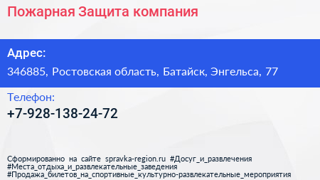 Пожарная Защита, компания по адресу 346885, Ростовская область, Батайск, Энгельса, 77 в дальнейшем Организация, размещена в следующих категориях: