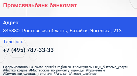 Промсвязьбанк, банкомат по адресу 346880, Ростовская область, Батайск, Энгельса, 213 в дальнейшем Организация, размещена в следующих категориях: