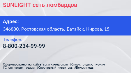SUNLIGHT, сеть ломбардов по адресу 346880, Ростовская область, Батайск, Кирова, 15 в дальнейшем Организация, размещена в следующих категориях:
