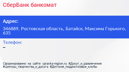 СберБанк, банкомат по адресу 346889, Ростовская область, Батайск, Максима Горького, 635 в дальнейшем Организация, размещена в следующих категориях: