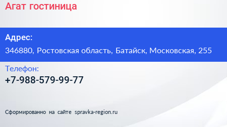 Агат, гостиница по адресу 346880, Ростовская область, Батайск, Московская, 255 в дальнейшем Организация, размещена в следующих категориях: