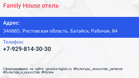 Family House, отель по адресу 346885, Ростовская область, Батайск, Рабочая, 84 в дальнейшем Организация, размещена в следующих категориях: