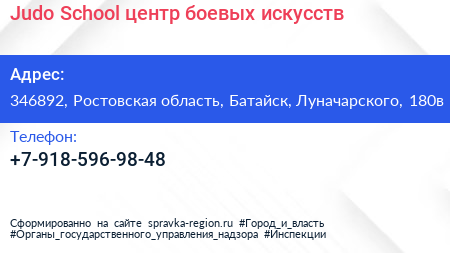 Judo School, центр боевых искусств по адресу 346892, Ростовская область, Батайск, Луначарского, 180в в дальнейшем Организация, размещена в следующих категориях: