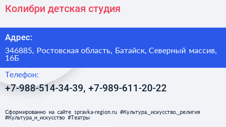 Колибри, детская студия по адресу 346885, Ростовская область, Батайск, Северный массив, 16Б в дальнейшем Организация, размещена в следующих категориях: