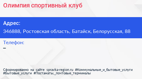 Олимпия, спортивный клуб по адресу 346888, Ростовская область, Батайск, Белорусская, 88 в дальнейшем Организация, размещена в следующих категориях: