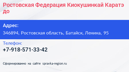 Ростовская Федерация Киокушинкай Каратэ-до по адресу 346894, Ростовская область, Батайск, Ленина, 95 в дальнейшем Организация, размещена в следующих категориях: