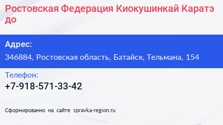 Ростовская Федерация Киокушинкай Каратэ-до по адресу 346884, Ростовская область, Батайск, Тельмана, 154 в дальнейшем Организация, размещена в следующих категориях: