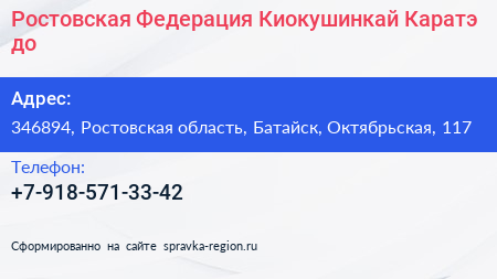 Ростовская Федерация Киокушинкай Каратэ-до по адресу 346894, Ростовская область, Батайск, Октябрьская, 117 в дальнейшем Организация, размещена в следующих категориях: