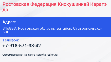 Ростовская Федерация Киокушинкай Каратэ-до по адресу 346889, Ростовская область, Батайск, Ставропольская, 50Б в дальнейшем Организация, размещена в следующих категориях: