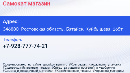 Самокат, магазин по адресу 346880, Ростовская область, Батайск, Куйбышева, 165т в дальнейшем Организация, размещена в следующих категориях: