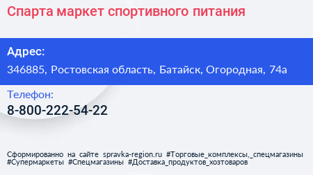 Спарта, маркет спортивного питания по адресу 346885, Ростовская область, Батайск, Огородная, 74а в дальнейшем Организация, размещена в следующих категориях: