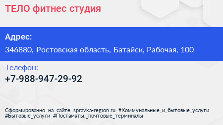 ТЕЛО, фитнес-студия по адресу 346880, Ростовская область, Батайск, Рабочая, 100 в дальнейшем Организация, размещена в следующих категориях: