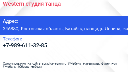 Western, студия танца по адресу 346880, Ростовская область, Батайск, площадь Ленина, 5а в дальнейшем Организация, размещена в следующих категориях: