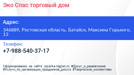Эко-Спас, торговый дом по адресу 346889, Ростовская область, Батайск, Максима Горького, 13 в дальнейшем Организация, размещена в следующих категориях: