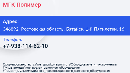 МГК Полимер по адресу 346892, Ростовская область, Батайск, 1-й Пятилетки, 16 в дальнейшем Организация, размещена в следующих категориях: