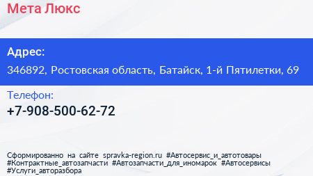 Мета-Люкс по адресу 346892, Ростовская область, Батайск, 1-й Пятилетки, 69 в дальнейшем Организация, размещена в следующих категориях: