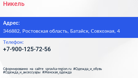 Никель по адресу 346882, Ростовская область, Батайск, Совхозная, 4 в дальнейшем Организация, размещена в следующих категориях: