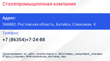 Сталепромышленная компания по адресу 346882, Ростовская область, Батайск, Совхозная, 4 в дальнейшем Организация, размещена в следующих категориях: