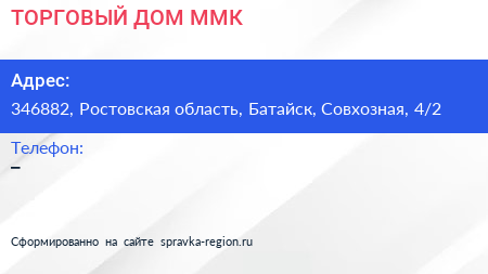 ТОРГОВЫЙ ДОМ ММК по адресу 346882, Ростовская область, Батайск, Совхозная, 4/2 в дальнейшем Организация, размещена в следующих категориях: