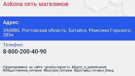 Askona, сеть магазинов по адресу 346880, Ростовская область, Батайск, Максима Горького, 285к в дальнейшем Организация, размещена в следующих категориях: